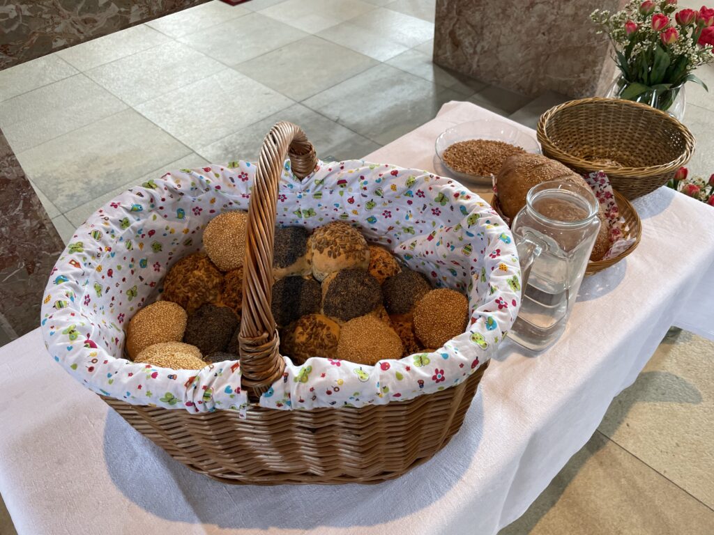 Im Rahmen der Erstkommunionsvorbereitung haben die Kinder während einer Tischrund selbst Brot gebacken. Dieses wurde am Tag darauf während des Gottesdienstes gesegnet und später bei der Agape verspeist. Lecker!