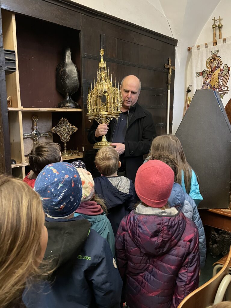 In den Genuss einer exklusiven Kirchenführung durch Diakon Gerold Hinteregger kamen unsere Erstkommunionskinder kurz vor Ostern. Gemeinsam mit Gerold durften sie die Schätze der St. Gallus Kirche erkunden, die Ohrringe von Kaiserin Maria Theresia bewundern und sogar bis nach oben in den Glockenturm steigen. Vielen Dank, lieber Gerold, für dieses tolle Abenteuer!