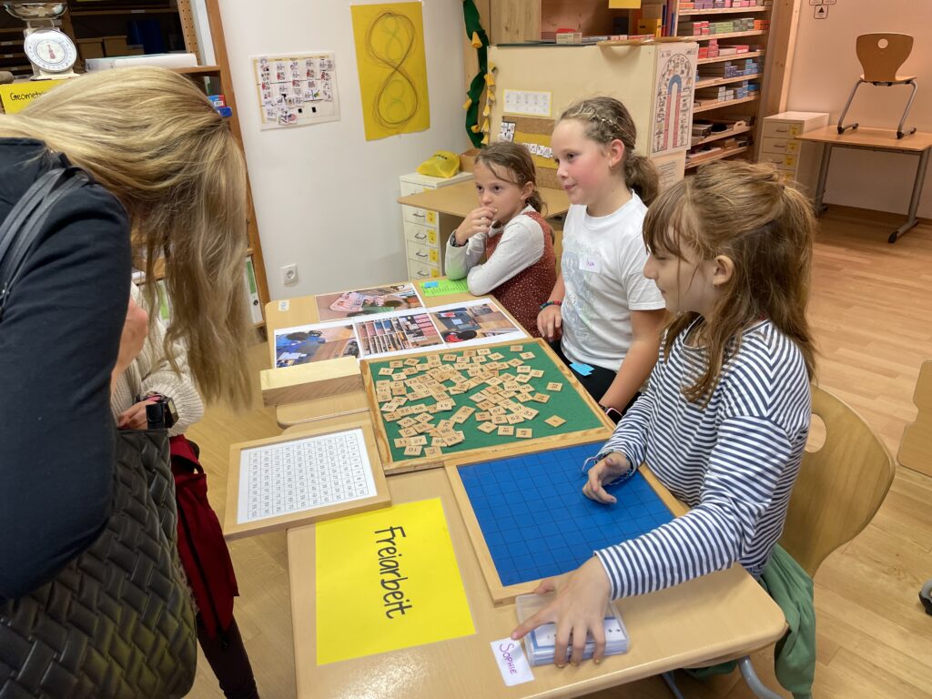Am Tag der offenen Tür war im kleinen Thomasbau einiges los. Zahlreiche Besucher:innen wollten alles über unsere kleine Volksschule erfahren. Glücklicherweise hatten wir große und kleine Expert:innen am Start, die den Neugierigen alles über die Freiarbeit, den Tagesablauf, unsere Woche, die Beurteilung und die Elternarbeit erklärten.